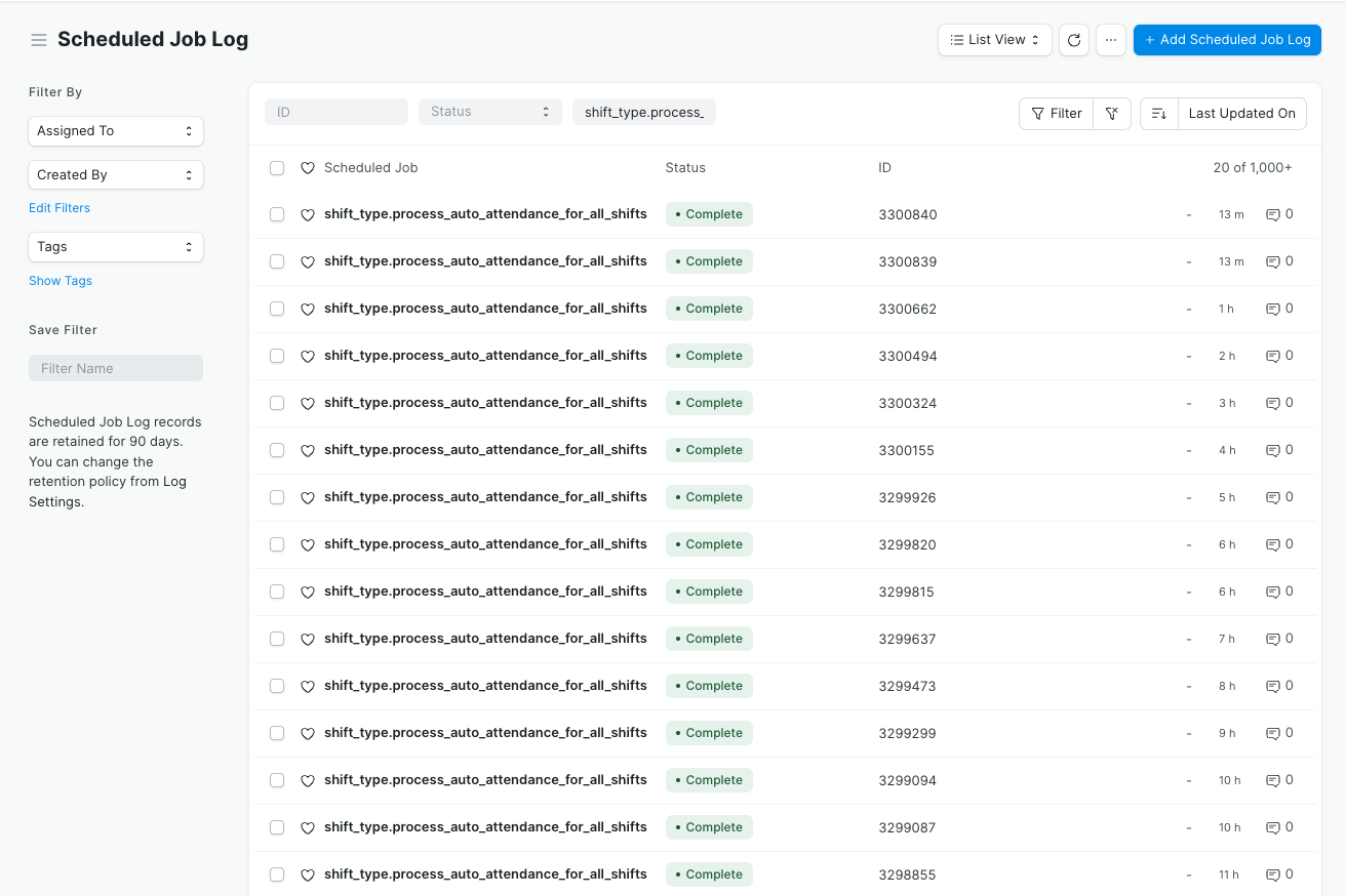 By default, ERPNext is running the schedular every hour, and you can also trigger manually by visiting the “Scheduled Job Type” doctyp and search for shift_type.process_auto_attendance_for_all_shifts, open this document and execute. You will see auto attendance would start…