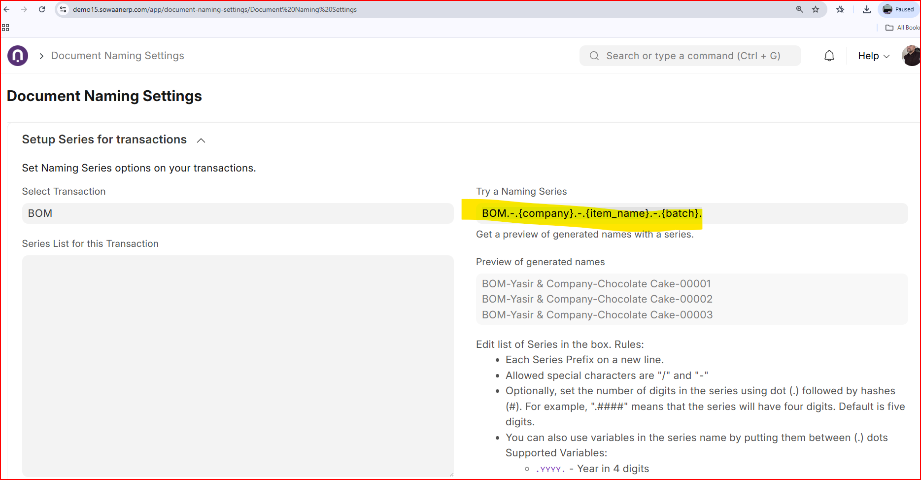 While I see there is an option to customize BOM naming in the BOM form, it does not seem to work as expected. Currently, BOMs are named using the format “Item Code – Revision.” However, in our pharmaceutical company, we manufacture several products with varying batch sizes, which means each BOM has different sub-assemblies (mostly multi-level) and multiple batch sizes.