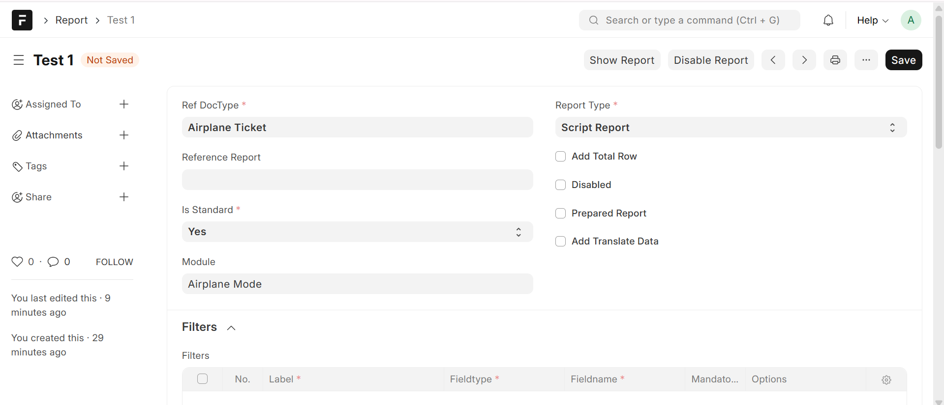 However, when a report is marked as Standard, Frappe ignores any Filters or Columns defined inside the DocType form — because standard reports must use the script’s return values (columns, data).