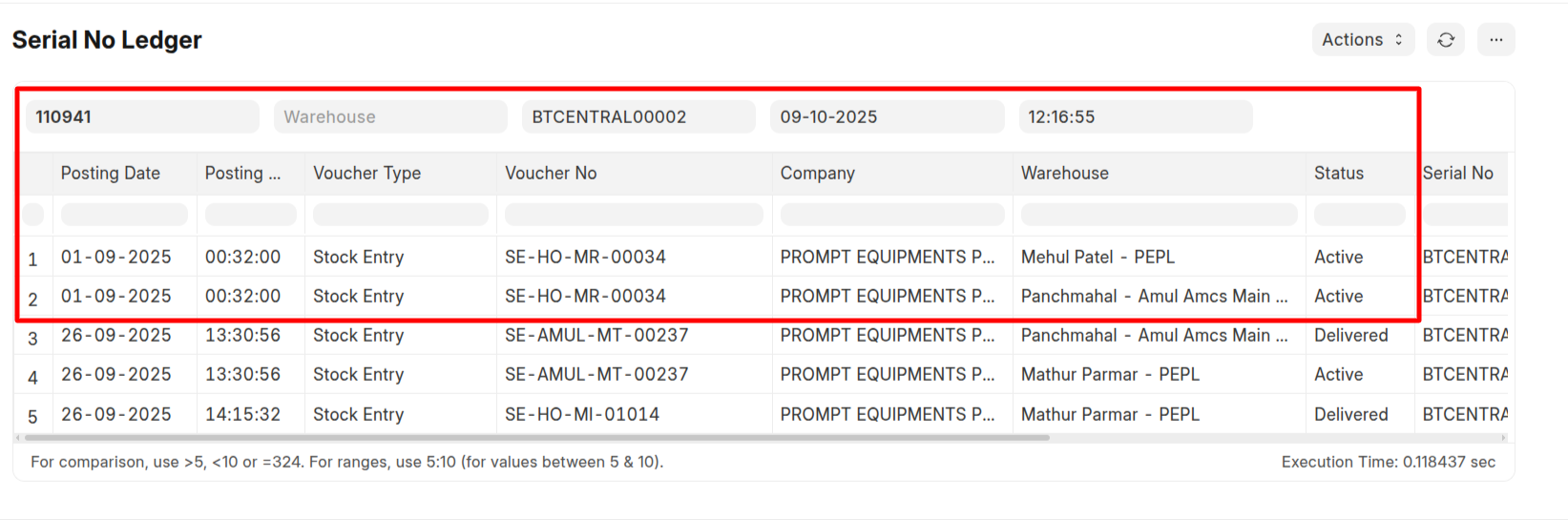 You can see both entries showing “Active” even though the same Serial No was used in two different warehouses in one transaction.