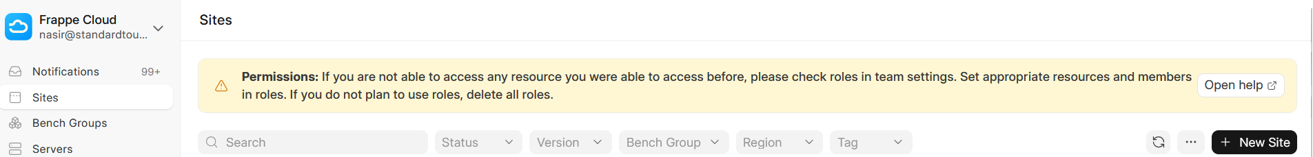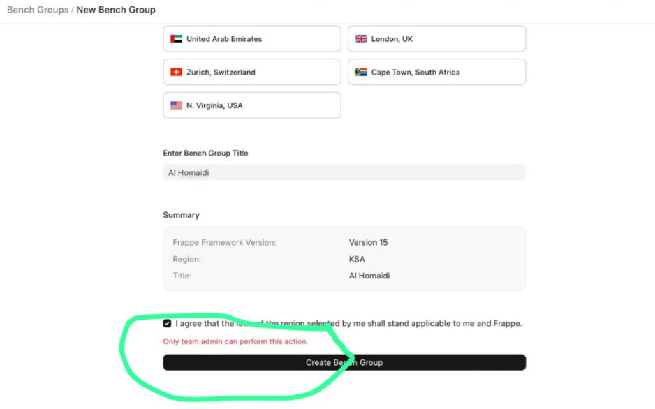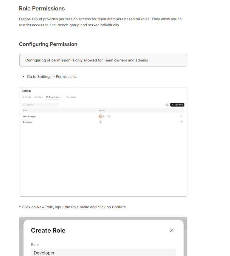 I had a previous role which had admin access (it has billing access). Now I have created a new role [ST Developers](pic 1) I am unable to give it admin role. Because of this, my developers are not able to create new benches. (pic 2)Now my developers are unable to create benches.