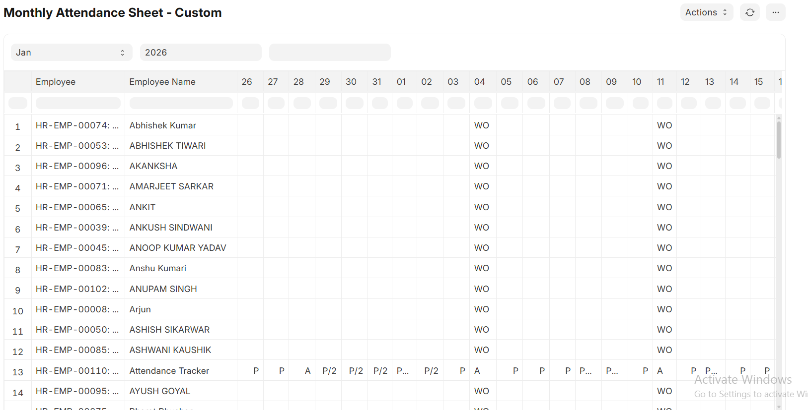 Each employee’s attendance status displayed under the correct day.