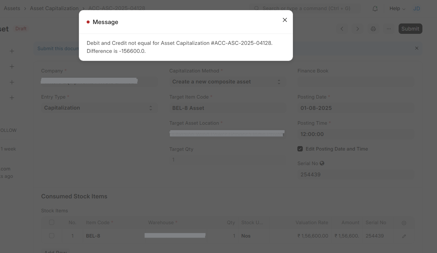 Debit and Credit not equal for Asset Capitalization #ACC-ASC-2025-00001. Difference is -156600.0