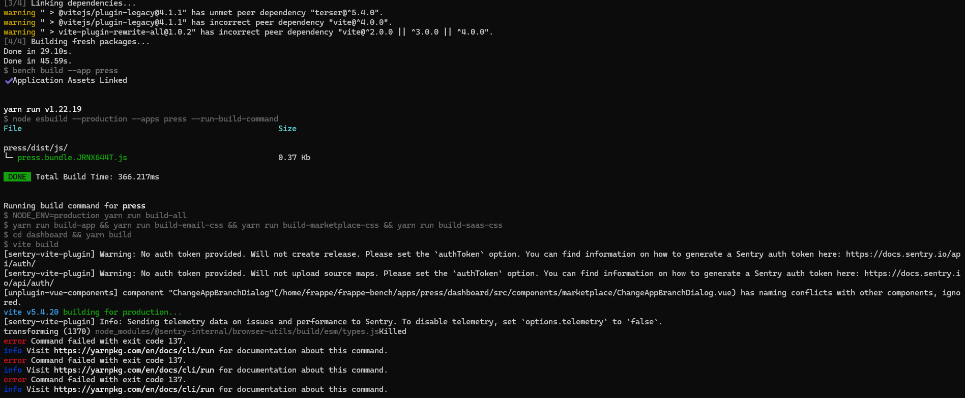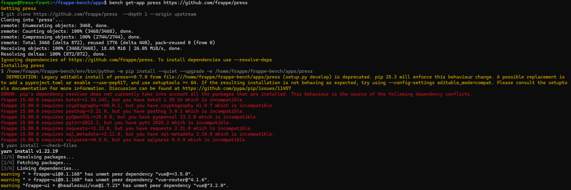 I am attempting to install the press app on a fresh Frappe Framework v15.86.0 installation and am encountering dependency conflicts that prevent installation and a subsequent bench build. I have tried installing with both the develop and master branches of the press app, and both attempts resulted in failure due to incompatible Python package versions.