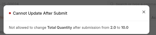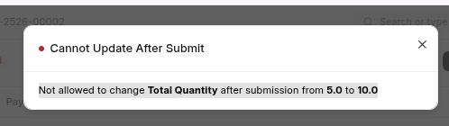 ”Not allowed to change Total Quantity after submission from 5.0 to 10.0”