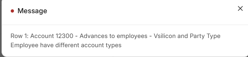 Translation: “Row 1: {Receivable Account} and Party Type Employee have different account types”