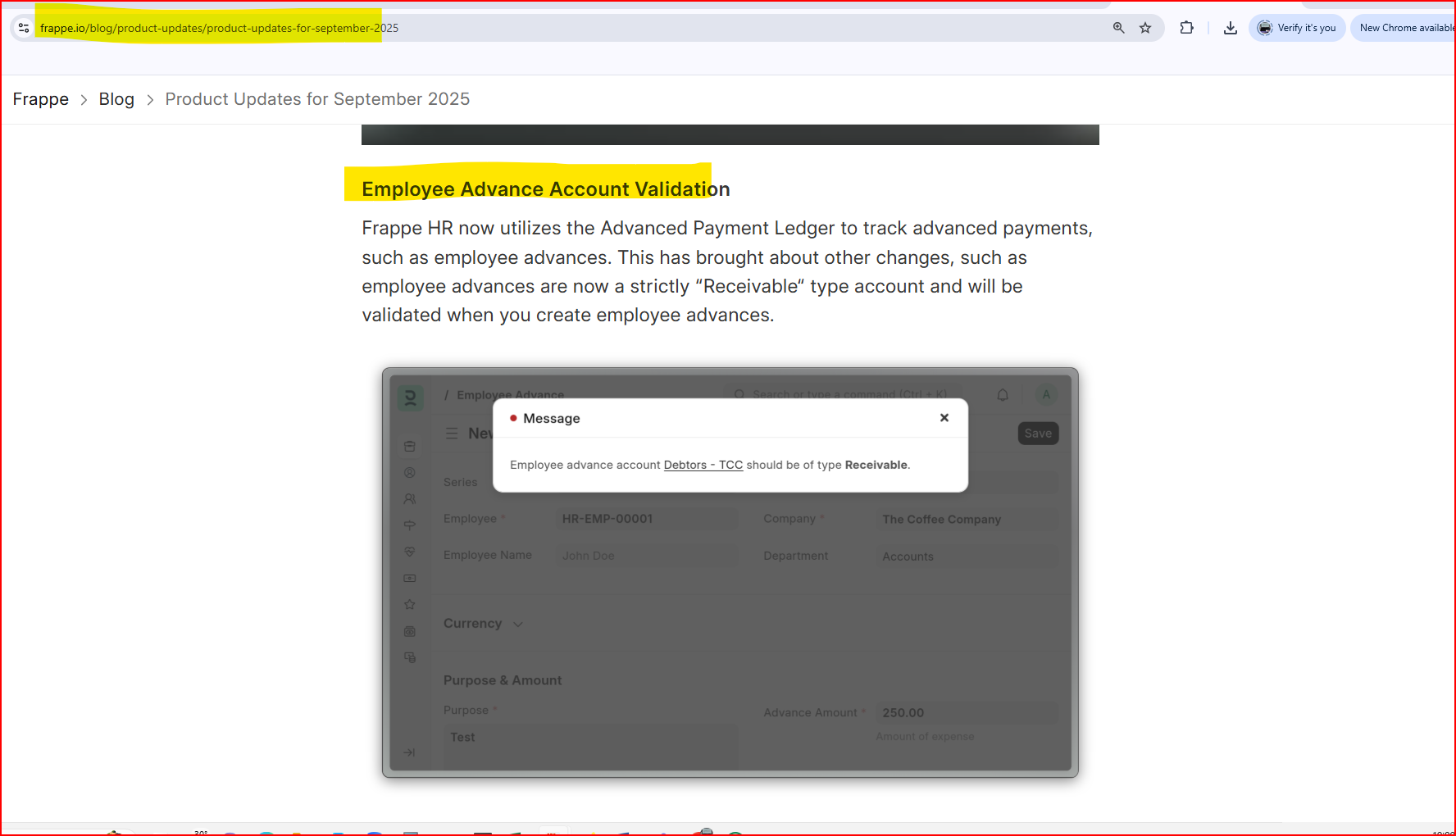 I’ve changed Account Type from Receivable to Cash and tried to create ‘Employee Advance’ but system show this error message.