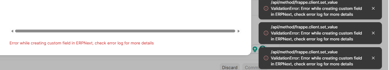 cant integrate frappe crm with erp Error while creating custom field in ERPNext, check error log for more details what im missing?