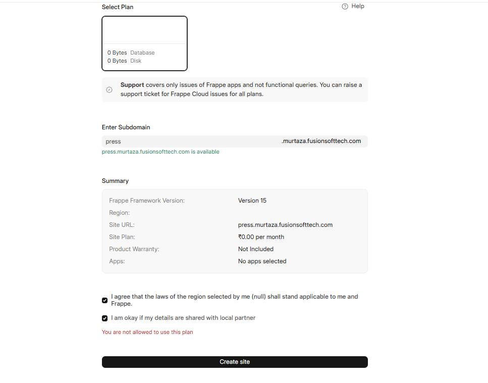 I have installed Frappe Press on my server and created a Site Plan with a price of 0 USD. I then onboarded a user successfully. However, after the user logs in and tries to create a new site using this plan, I encounter the error shown below.