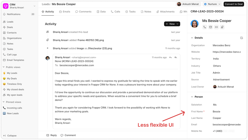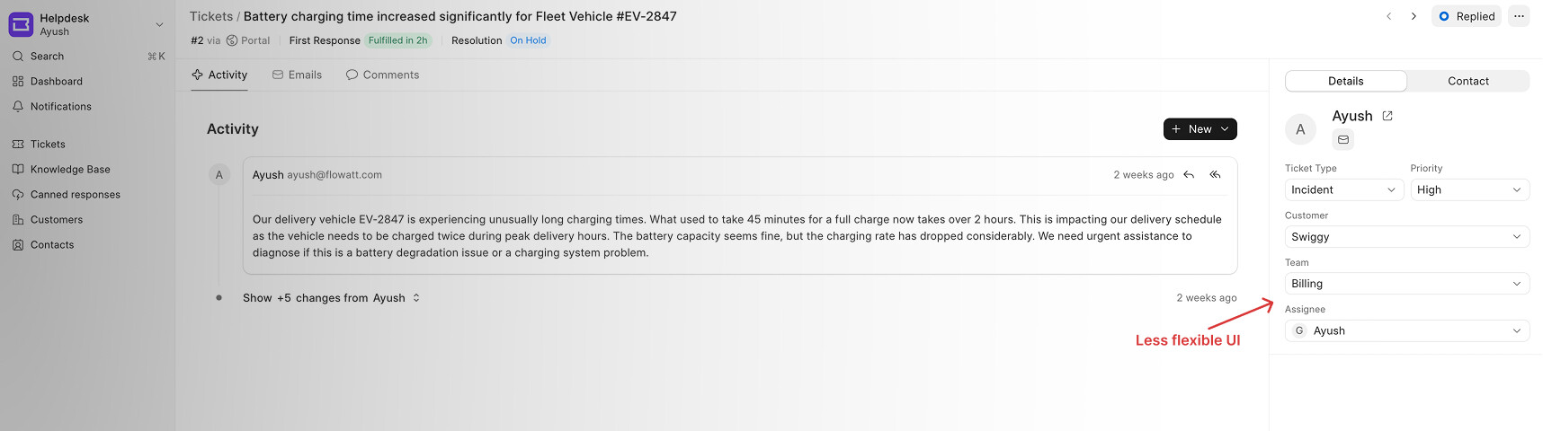 On the other hand, Frappe CRM and Helpdesk have their own frontend UI. While they look great and offer a modern user experience, the form customisation capabilities (e.g., layout, conditional visibility, scripts, automation, etc.) are more limited compared to what we can achieve in Desk UI. This sometimes makes it tricky when we demonstrate solutions to clients who expect a similar level of flexibility across all apps.