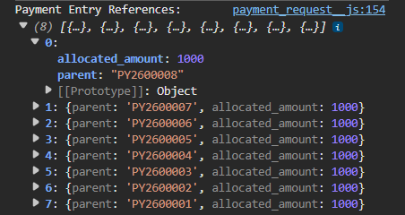 I have tried to get the list Payment Entry Reference from Payment Request. When I return specific fields like reference_name, parent and other fields, it only returns allocated_amount and parent.