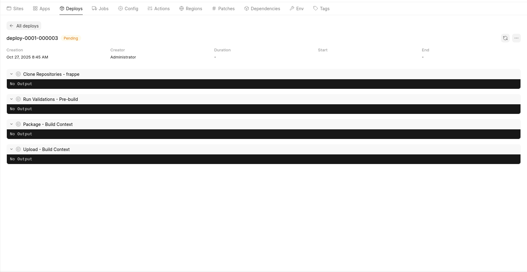 However, when I try to create or deploy an app, the deployment stays stuck in “Pending”.