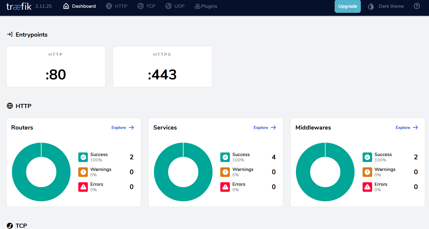 Traefik takes care of the Let’s Encrypt certificate. This may take a while depending on the domain name registrar, but should normally be possible within 5 minutes.