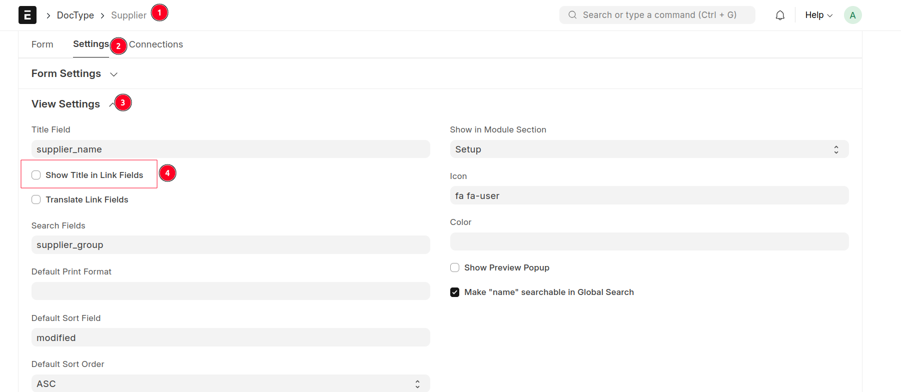 In standard forms, when we select a supplier, Frappe automatically shows the Supplier Name (the title field) instead of the Supplier ID — because the Supplier doctype has a title field set as supplier_name.