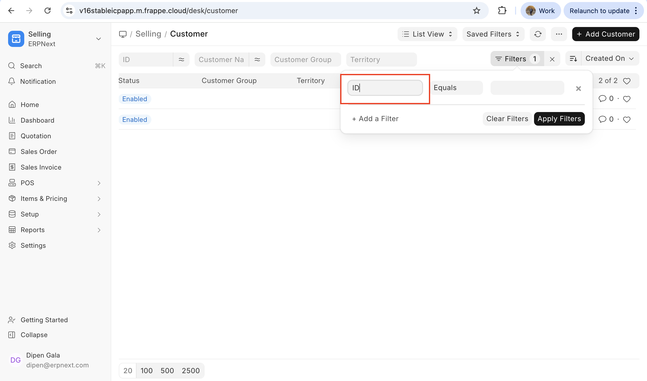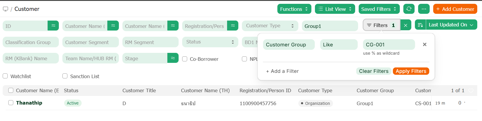 For example, if Customer name is CUS-0001 and title is John, then customer like "John" or customer in ["John"] will not work because the system expects CUS-0001.