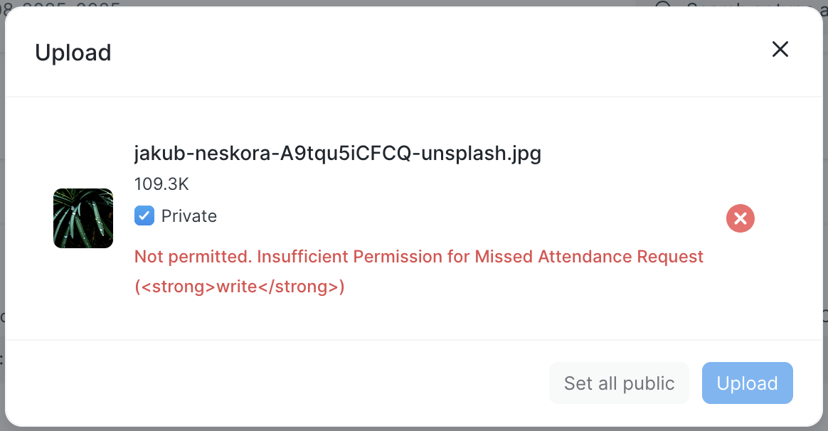 "Not permitted. Insufficient Permission for Missed Attendance Request (write) "
