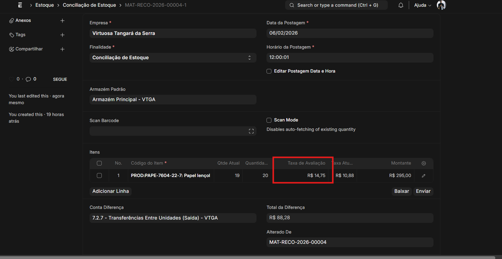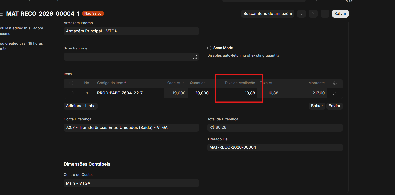 Inventory reconciliation. The valuation rate automatically changes to the default value registered for the item, even if I enter a different value in the field.