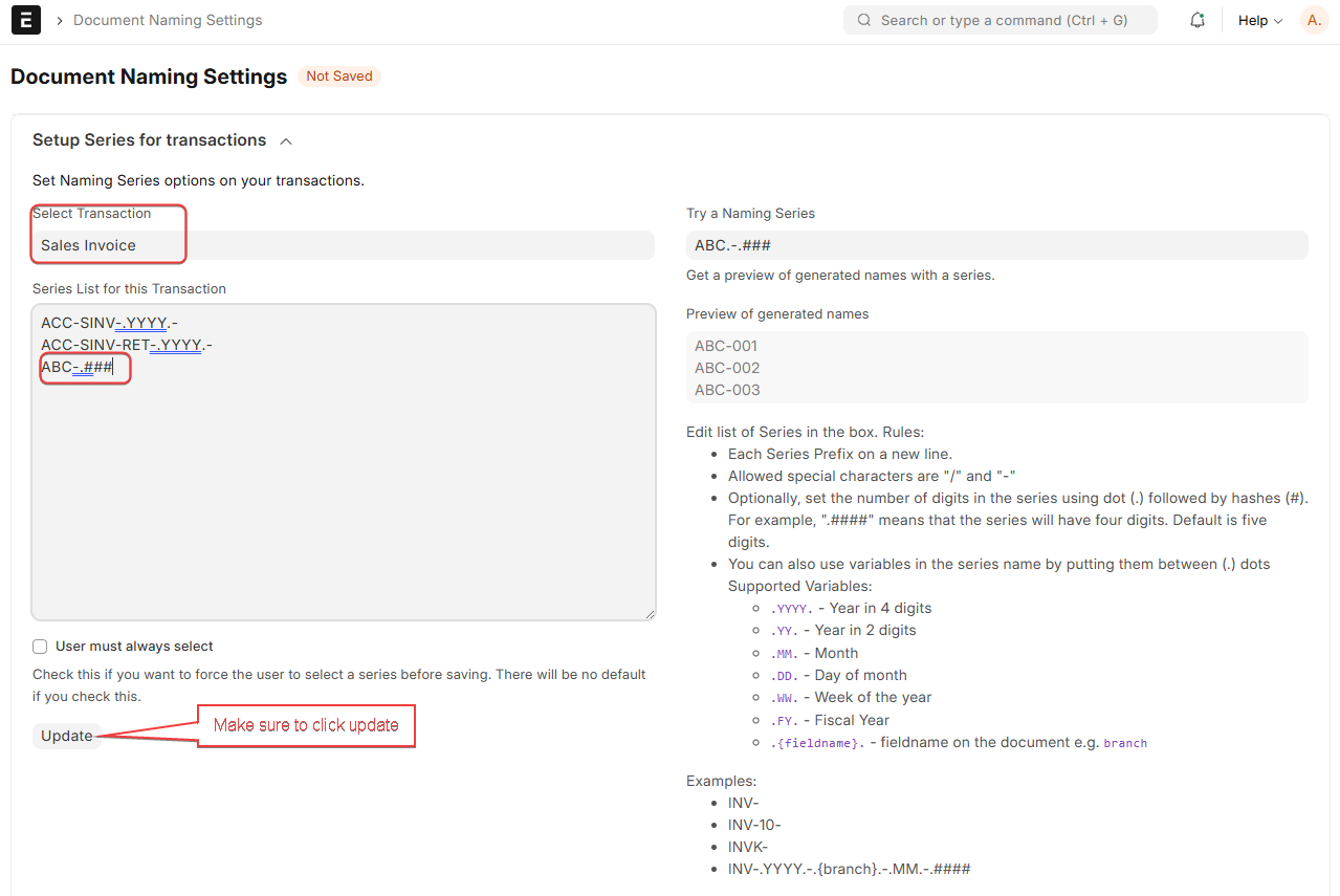 Add the invoice naming rule in “Document Naming Settings” → Transaction: sales invoice