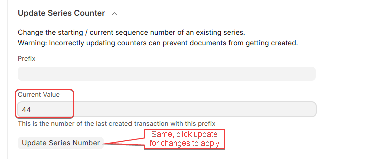 If your team will be using the system at the same time as the migration is happening, set “Current Value” under “Update Series Counter” to the last invoice number you have processed (i.e. if your naming convention is ABC-123 and the last invoice is ABC-044, set the number to 44)