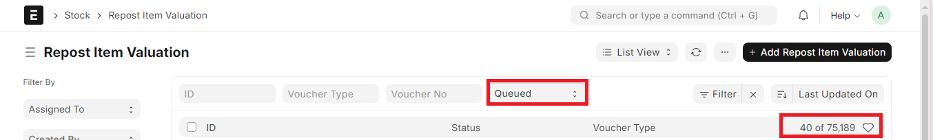 hi. i am using erpnext v15. i have 74,614 items queued for repost item valuation and 26 in progress repost item valuation, how do i make this queueing faster or submit them all at once? since the latest that’s queued is still 12 months ago and i am not getting the correct item valuation. thanks/
