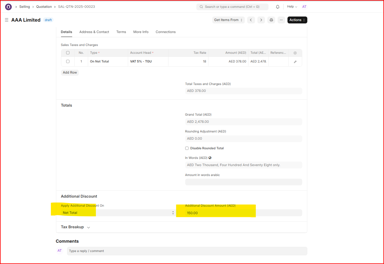 On the other hand, if discount is common for the whole Quotation then Additional Discount section is available under tax table where one can apply discount either on Net total (item table total before tax) or grand total (item table total + tax ). In your case, additional discount on net total where amount based discount is applied resulting a new net total as 2100 ;
