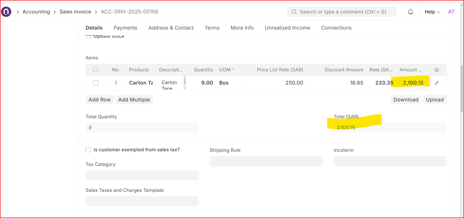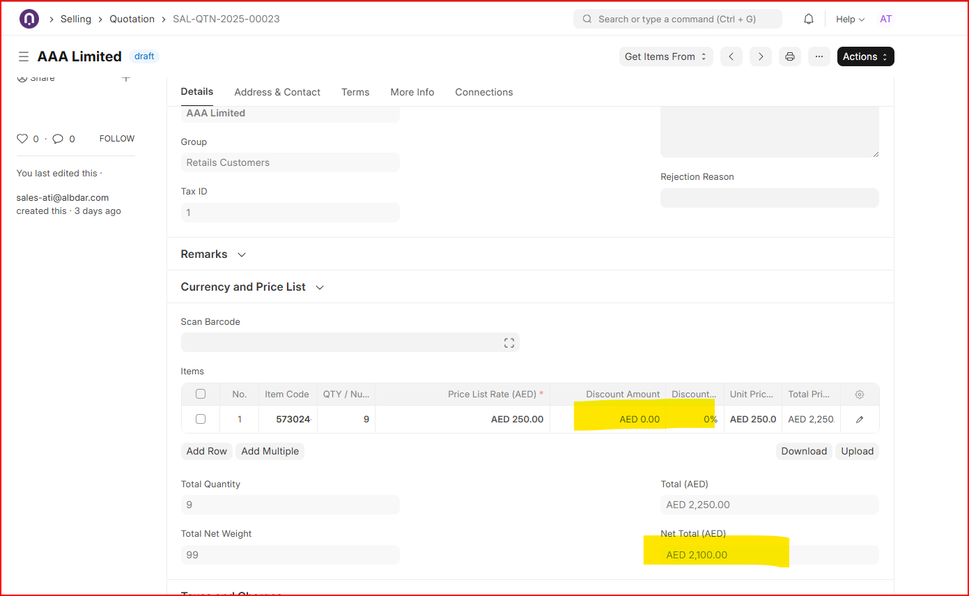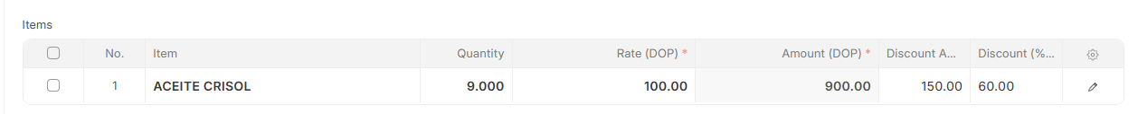 For example: quantity 9 × rate 250 = 2,250. After applying a discount of 150, the new total should be 2,100, while the item rate should remain 250 and only the amount should be affected.