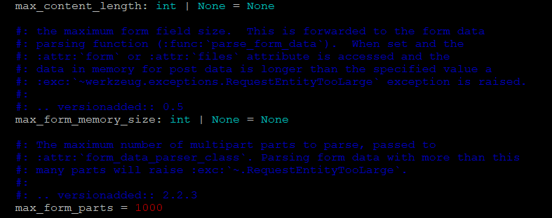 The above screenshot is from request.py file where various limits are enforced. In latest werkzeug versions, they (not frappe) are enforcing these limits. In earlier versions there were no such limitations. One such limitation enforced with following variable: