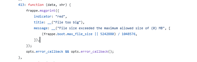 We have developed a custom doctype which has around 20 child tables. These child table may contain large number of rows. When I tried to save the record, then on site I got the dialogue box with message “File size exceeded the maximum allowed size of 50 MB“. Second, on browser console it was showing error coming from request.js file. This code is available at frappe/frappe/public/js/frappe/request.js at develop · frappe/frappe · GitHub