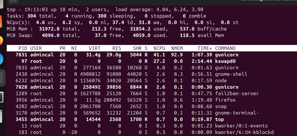 CAUTION: But you should not run these commands when you don’t have sufficient memory free, otherwise your server may get trapped in problematic condition. Especially production server it is not recommended. In your case as application server is in separate server, you may restrict memory swappiness as I mentioned earlier and limit gunicorn workers.