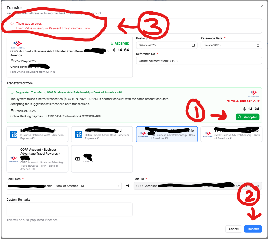 When trying to reconcile a credit card payment from bank account as ‘Transfer’, MINT successfully suggests a mirrored transaction, but when I click “Accept”, and then click Transfer”, an error message pops up: