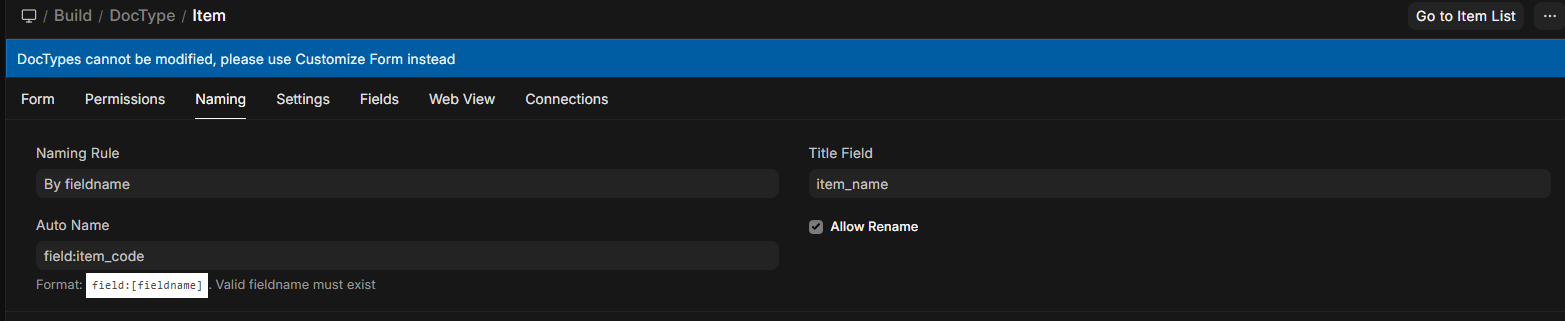 It seems like the issue is that in the DocType Item, the naming settings are set to the item_code fieldname, so settings I change elsewhere (such as customize form) are getting overwritten by the doctype settings, which I can’t edit.