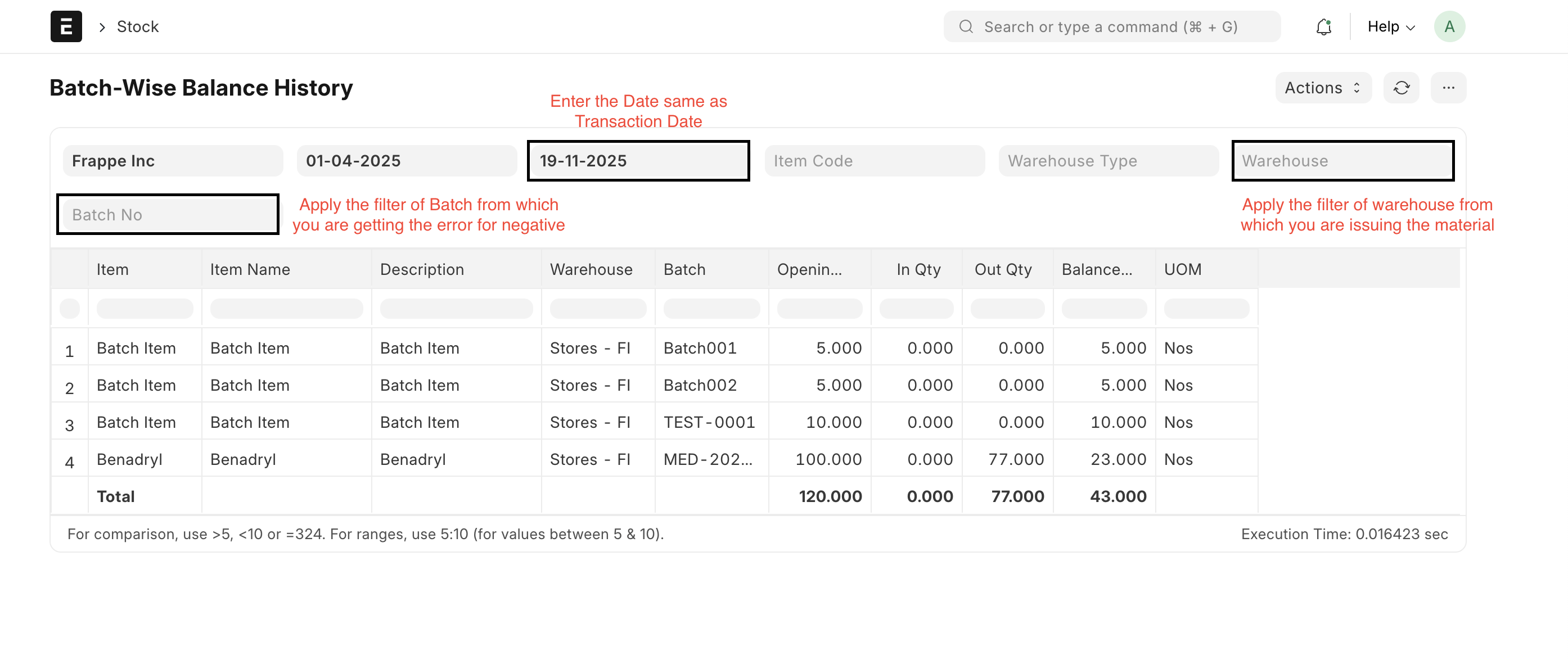 After applying the above filter you will get the data on the screens where you can see the data of the item and its relevant batch. The user can check the stock available or not.