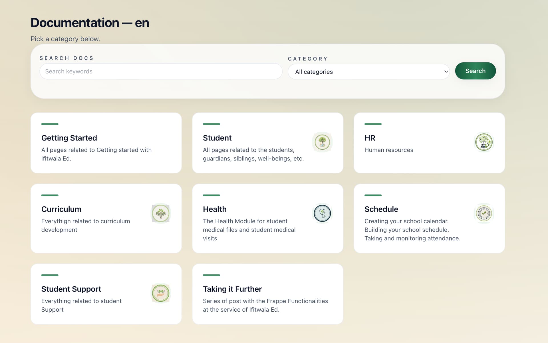 Documentation Main page with cards for each documentation category. The search bar is not yet functional.