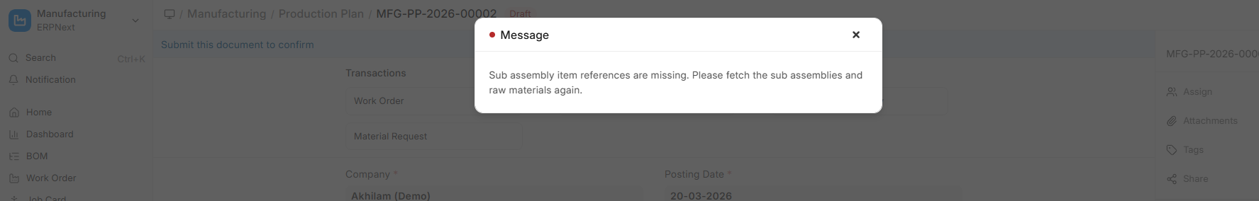 When i am creating production plan with finished Goods BOM and linked sub assembly BOM against the same, it is showing below error when reserving stock for the items mentioned in the BOM available in the warehouse.
