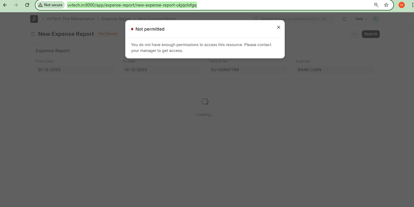 I created a DocType called “Expense Report” with a client script for generating vehicle expense reports. When trying to access the form, I get a permission error: