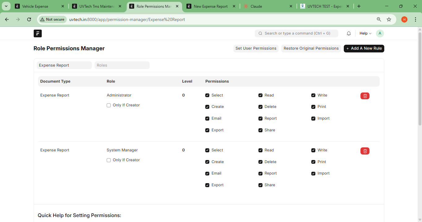 Getting “Not permitted” error when trying to access custom “Expense Report” DocType, despite having Administrator/System Manager roles assigned.
