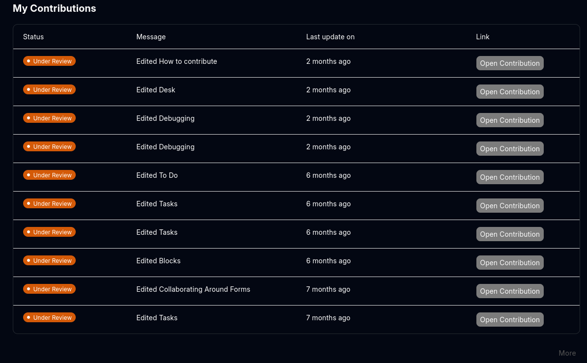 Bump. It would be nice to know that someone at Frappe is looking at Documentation contributions. My contributions have been sitting for months with not response - for that reason I’ve stopped contributing (at least for now):