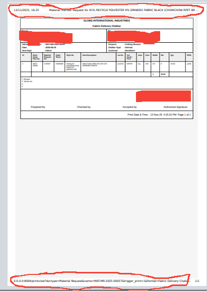 below is custom code if anyone can help<!DOCTYPE html> <html lang="en"> <head> <meta charset="UTF-8" /> <title>Material Request</title> <style> body { margin: 0; padding: 20px; font-family: Arial, sans-serif; font-size: 9px; background-color: #f5f5f5; } .document { width: 100%; max-width: 800px; margin: 0 auto; background-color: white; border: 1px solid black; padding: 0; } /* Header */ .header { text-align: center; font-weight: bold; font-size: 10px; padding: 3px; border-bottom: 1px solid black; background-color: white; } .title-section { text-align: center; font-weight: bold; font-size: 10px; padding: 3px; border-bottom: 1px solid black; background-color: white; } .address-section { border-bottom: 1px solid #000; } .address-row { display: flex; border-bottom: 1px solid #000; } .from-section, .to-section { width: 50%; padding: 4px; } .from-section { border-right: 1px solid #000; } .section-header { font-weight: bold; margin-bottom: -3px; margin-top: -3px; font-size: 10px; } .section-headerx { font-weight: bold; margin-bottom: -3px; margin-top: -3px; font-size: 10px; padding: 3px; } .company-info { margin-bottom: -3px; font-size: 9px; } .meta-row { display: flex; } .from-meta-section, .to-meta-section { width: 50%; padding: 0; } .from-meta-section { border-right: 1px solid #000; } .meta-info { display: flex; justify-content: space-between; margin-top: 1px; line-height: 1px; } .meta-info td { padding: 1px 1px 1px 0; font-size: 8px; vertical-align: top; } .intro-text { text-align: center; padding: 6px; border-bottom: 0px solid #000; font-size: 8px; } /* .brand { margin: 8px 0 4px; font-weight: 700; font-size: 10px; } */ .data-table { width: 100%; /*border-collapse: collapse;*/ font-size: 7px; border-collapse: collapse; border-spacing: 0; margin: 0; padding: 0; } .data-table, .data-table th, .data-table td { border: 1px solid #000; padding: 0; margin: 0; line-height: 1; text-align: middle; word-wrap: break-word; text-overflow: ellipsis; white-space: normal; } .data-table { width: 100%; /*border-collapse: collapse;*/ font-size: 7px; border-collapse: collapse; border-left:none !important; border-right:none !important; margin-top:-1px; /*border-spacing: 0;*/ /*margin: 0;*/ /*padding: 0;*/ } .data-table th { background: #f0f0f0; padding: 0px 0px; font-weight: bold; font-size: 7px; } .center { text-align: center; } .data-table th:first-child, .data-table td:first-child { border-left: none; } /* Remove right border from last column */ .data-table th:last-child, .data-table td:last-child { border-right: none; } /* Material Request table column widths */ .w-sr { width: 1%; } .w-wop { width: 7%; } .w-mrno { width: 7%; } .w-order { width: 4%; } .w-style { width: 10%; } .w-item { width: 24%; white-space: normal; } .w-lot { width: 5%; } .w-color { width: 7%; } .w-uom { width: 4%; text-align: left; } .w-gsm { width: 4%; text-align: left; } .w-width { width: 4%; text-align: left; } .w-rolls { width: 4%; text-align: left; } .w-qty { width: 6%; text-align: left; } .w-rfid { width: 13%; white-space: normal; text-align: left; } /* Section header */ .section-header { font-weight: bold; margin-bottom: -3px; margin-top: -3px; font-size: 10px; } /* Totals rows */ .totals-row td { background: var(--g); font-weight: 700; } .sign-brand { width: 100%; display: flex; justify-content: flex-end; font-size: 12px; font-weight: 700; } .sign-line { width: 100%; display: flex; justify-content: space-between; font-size: 10px; } .print-meta { width: 100%; display: flex; justify-content: space-between; align-items: center; gap: 8px; font-size: 10px; } .print-meta p { margin: 0; } .print-info { display: flex; gap: 10px; justify-content: end; } /* Missing sections */ .amount-in-words { padding: 4px; /* less top/bottom padding */ border-bottom: 1px solid #000; /* use solid black (or pick a color) */ font-size: 10px; /* smaller font */ display: block; font-weight: bold; /* ensures it behaves like a block */ width: 100%; /* spans full width */ } .signature-section { padding: 8px; border-bottom: 1px solid var(--b); font-size: 10px; } .footer { display: flex; justify-content: space-between; padding: 8px; font-size: 10px; } .reference-section, .terms-section, .conditions-section, .signature-section { padding: 8px; border-bottom: 1px solid black; min-height: 80px; font-size: 10px; } .conditions-title { text-decoration: underline; font-weight: bold; margin-bottom: 8px; } .signature-line { display: flex; justify-content: space-between; margin-top: 40px; } .signature-line span { font-size: 10px; border-bottom: 1px ; padding-bottom: -3px; width: 120px; text-align: center; } .footer { display: flex; justify-content: space-between; padding: 8px; font-size: 10px; } .print-info { display: flex; gap: 5px; } .remarks-section { padding: 4px; border-bottom: 1px solid black; font-size: 7px; } /* Print-specific styles */ @media print { .label { border: none !important; outline: none !important; background: transparent !important; box-shadow: none !important; } * { -webkit-print-color-adjust: exact !important; print-color-adjust: exact !important; } } </style> </head> <body> <div class="document"> <!-- Header --> <div class="header"> {{ doc.company or "GLOBE INTERNATIONAL INDUSTRIES" }} </div> <div class="title-section">Fabric Delivery Challan</div> <!-- Parties / Details --> <div class="address-section"> <div class="address-row"> <!-- From --> <div class="from-section"> <div class="section-header">From</div> <div class="company-info"> <strong >{{ doc.company or "GLOBE INTERNATIONAL INDUSTRIES" }}</strong ><br /> STREET# 13, PLOT# 207, PUBLIC FREE ZONE,<br />ALEXANDRIA, EGYPT </div> </div> <!-- To --> <div class="to-section"> <div class="section-header">To</div> <div class="company-info"> <strong>GLOBE CUTTING SECTION</strong><br> STREET# 13, PLOT# 207, PUBLIC FREE ZONE,<br>ALEXANDRIA, EGYPT </div> </div> </div> <!-- Meta lines (merged fields) --> <div class="meta-row"> <div class="from-meta-section"> <table class="meta-info"> <tr> <td><strong>Delive