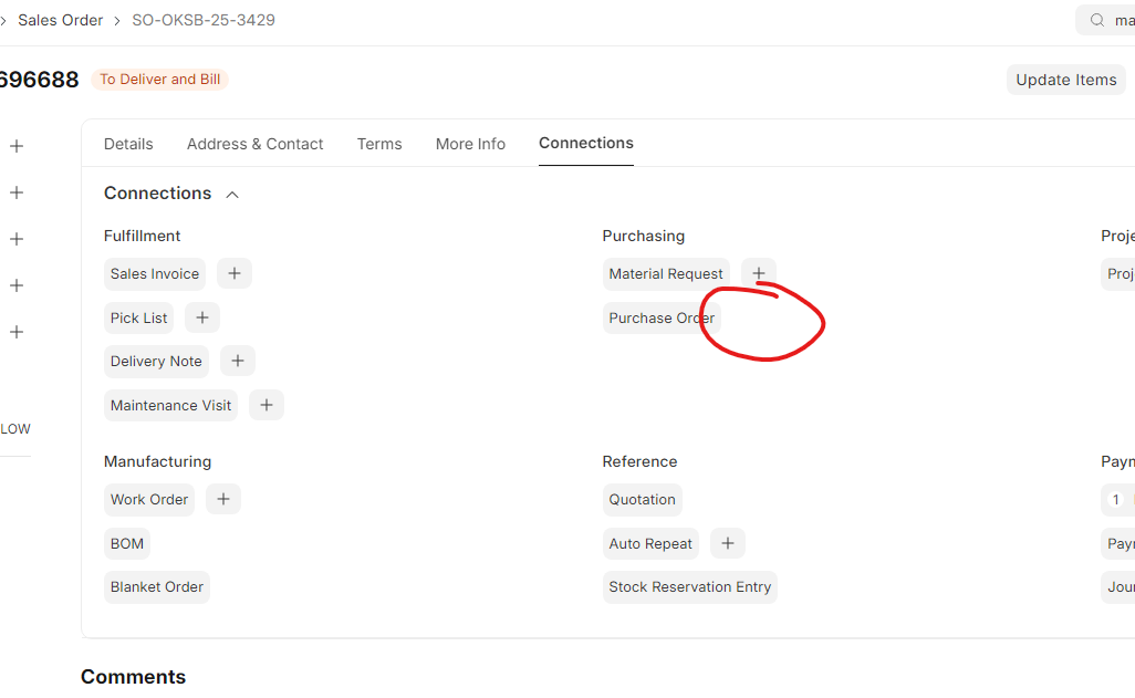 After recent update, ERPNext: v15.91.0 (HEAD), under Sales Order → Connections → Purchase Order “+” is missing. Under Sales Order → Create → Purchase Order still work like normal though.