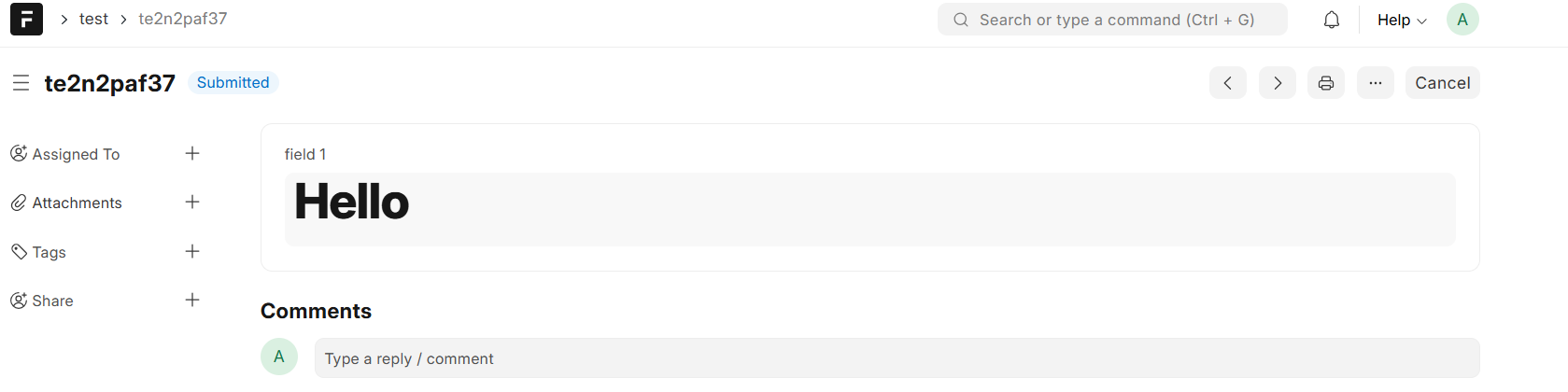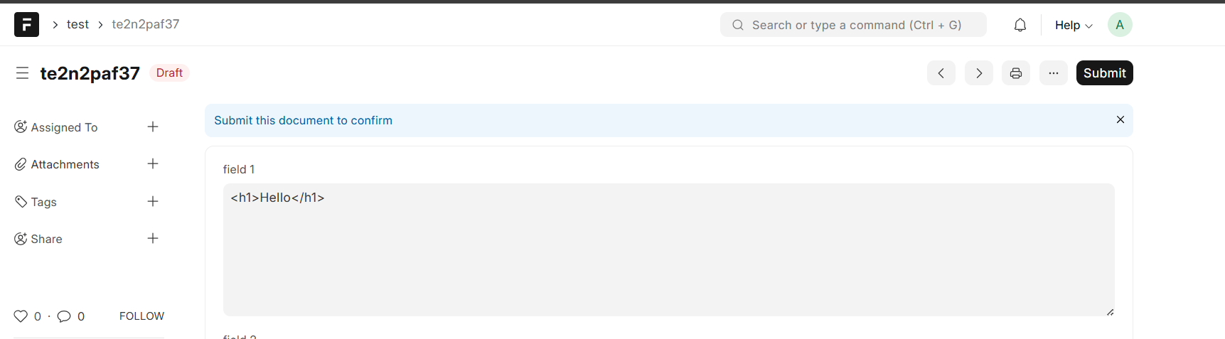 <h1>Hello</h1>in the Small Text field - Save and submit the document