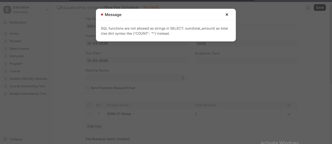 Recently I’m exploring the frappe education app. During creating a new Fee Schedule I’m encountering the below message.