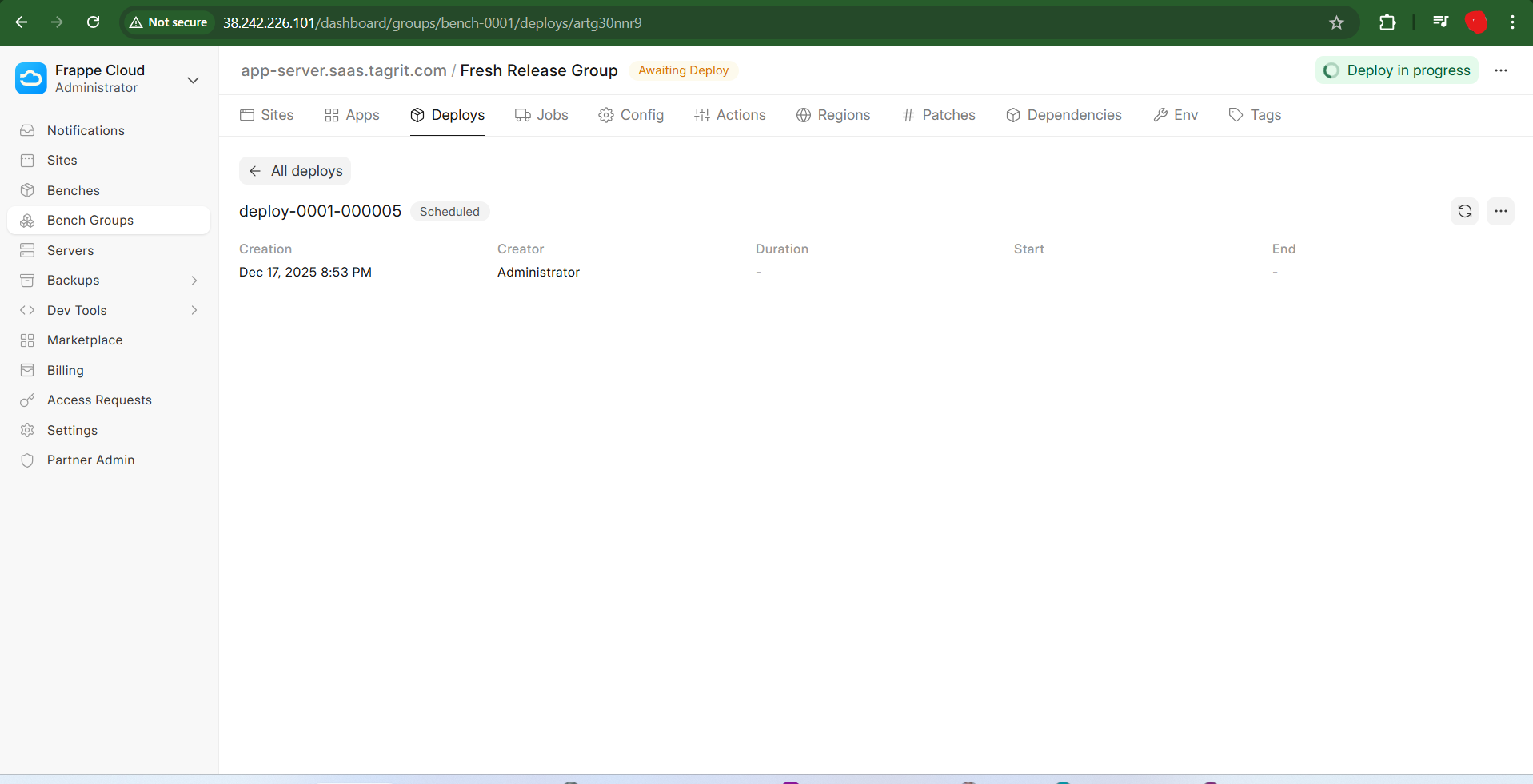 I am seeking assistance with a persistent issue in Press where the “Deploy Candidate” process remains stuck in the “Deploy in progress” state indefinitely. There are no error logs generated in the Press UI, and the background workers appear to be running but are not picking up the tasks.