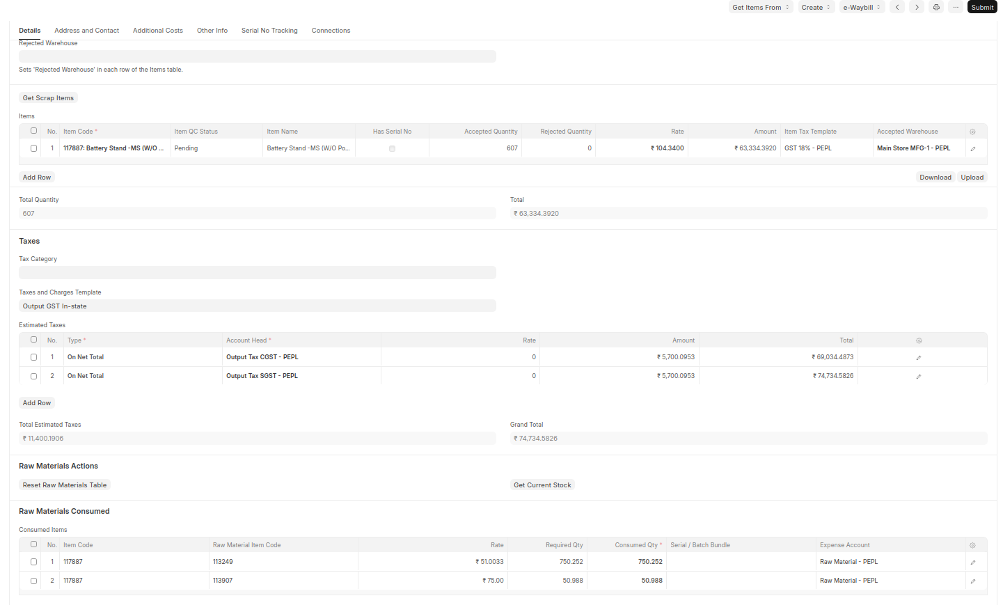 I have created below subcontracting receipt and mentioned below finish good and RM with respective amount