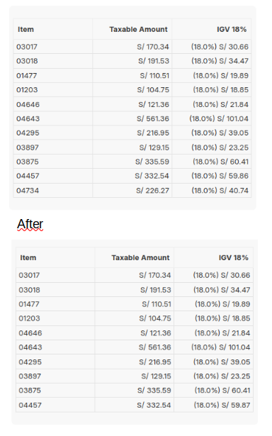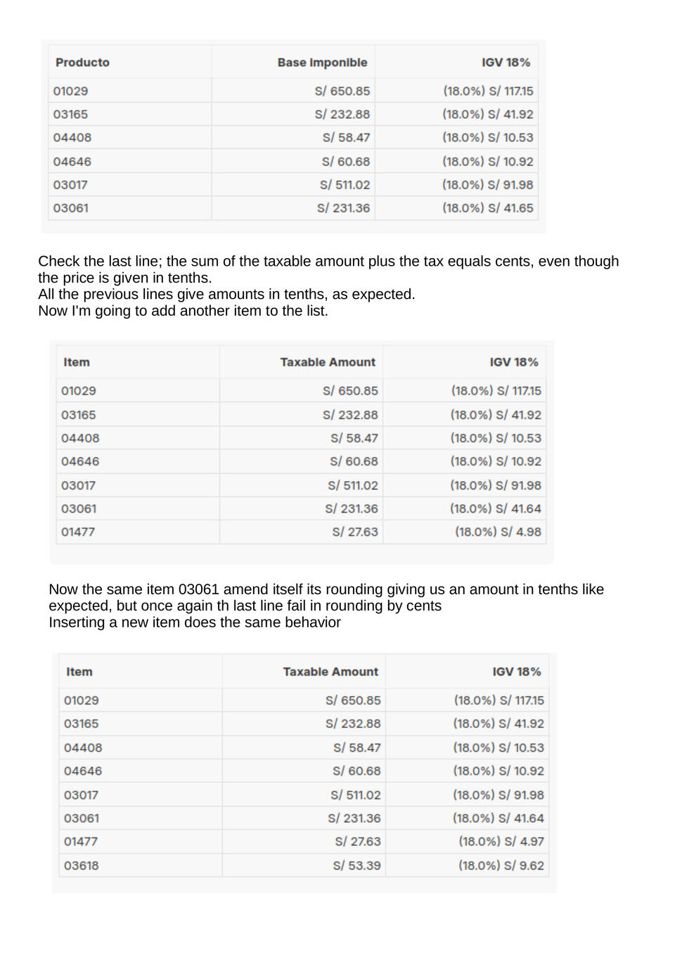 The overall precision on quotation, sales order and invoice is correct but when you apply tax breakup the last line of the items fail in rounding. If you add another line of item the previous failed line it corrects itself automatically, but the last line entered is still inaccurate.