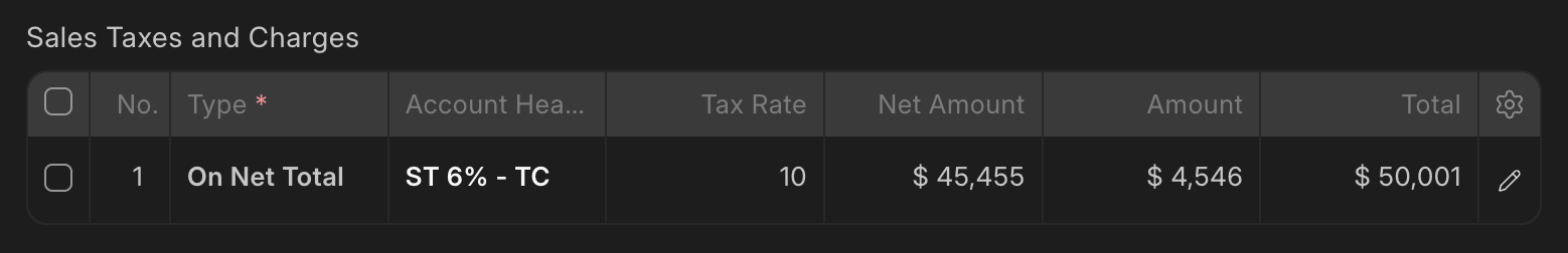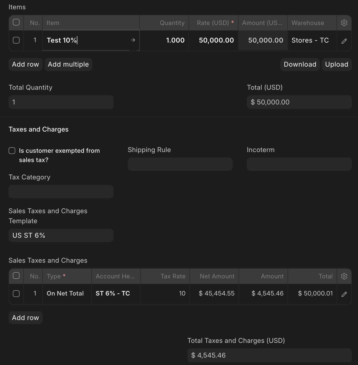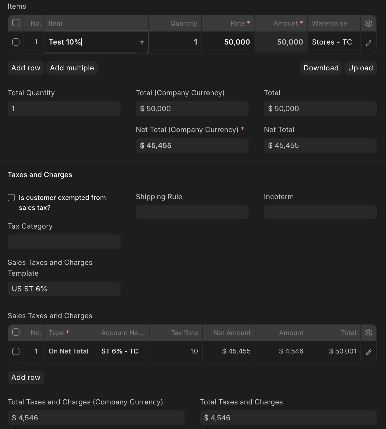 This is a clean install with US region and USD currency. The tax template “US ST 6%” was modified to have 10% tax rate and “Is this Tax included in Basic Rate?” is checked for tax inclusive pricing.