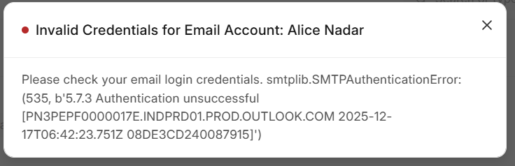 “Please check your email credentials. smtplib.SMTPAuthenticationError: (451, b’4.7.0 Temporary server error. Please try again later. PRX5 [FR0P281CA0189.DEUP281.PROD.OUTLOOK.COM 2024-12-16T23:06:25.873Z 08DD1D73933D3035]')”