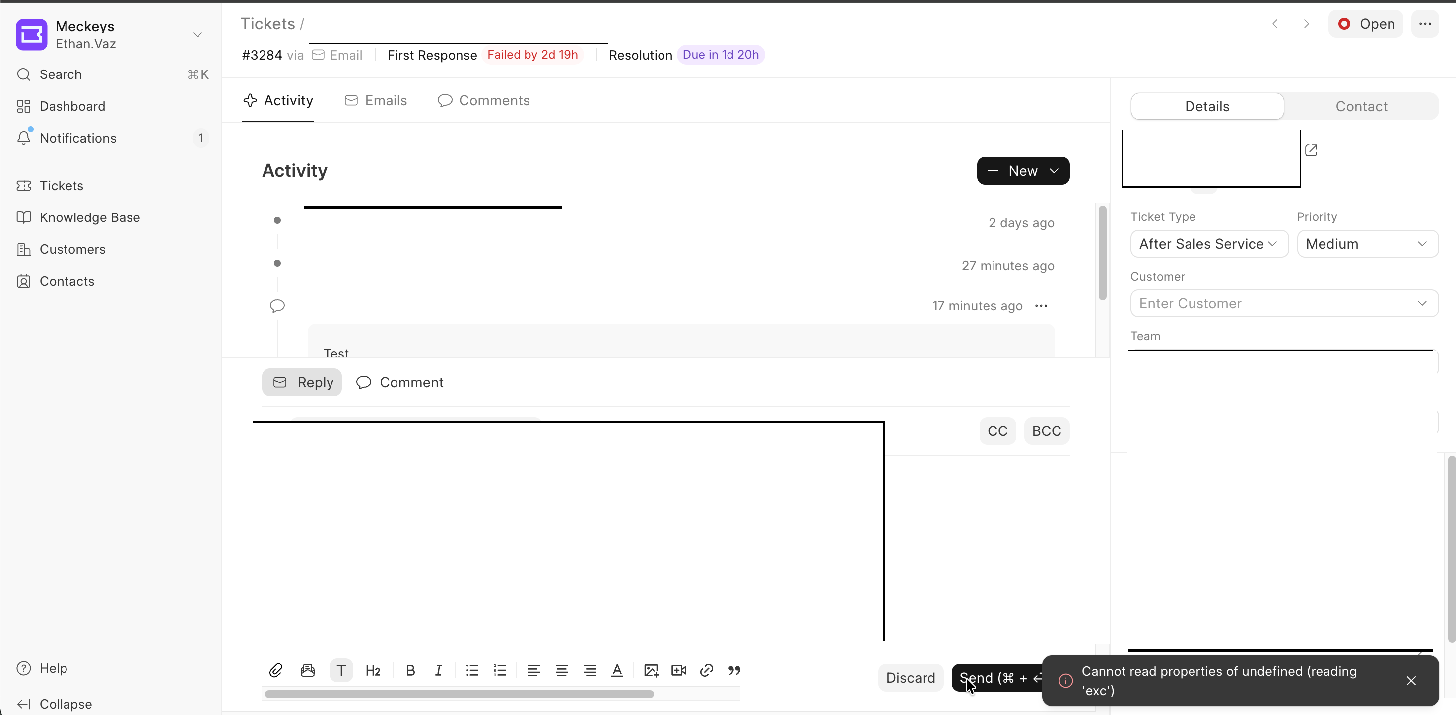 I am currently unable to reply to a customer’s Helpdesk ticket. Whenever I attempt to respond using the “Reply via Agent” option, the action fails and the reply is not sent.