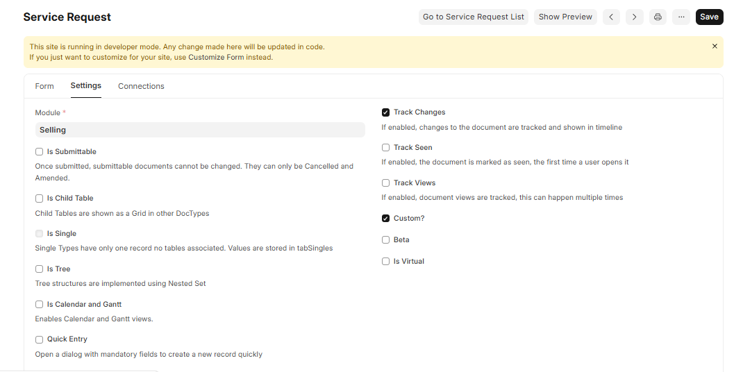 I havea Doctype CAlled Service Request Which i Need to Export to my custom app, I Already tried Fixtures, Export Doctype from bench console, and after i change the module to my custom app it get created into my app, but after bench migrate the doctype “Custom?” Checkbox get auto tick & module changes to Selling again.