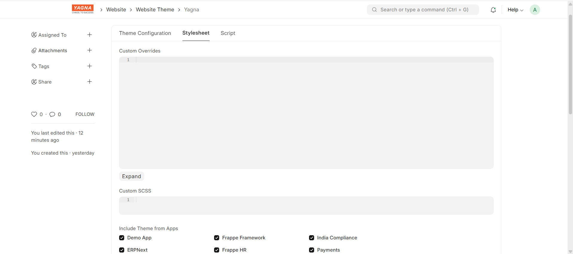I am doing revmap of website built on wordpress now using ErpNext/ Frappe framework. So here I am working towards setting up the structure and theme to the website. What should I do should I add the css to website theme which will be applied to entire website or should cutom write css per sprecific webpage like different css for home page different for about us page and so on… I am doing webdevelopment for the first time.. One more quiestion was there… In the website theme section or module where should I add the css script in the custom override or scss?
